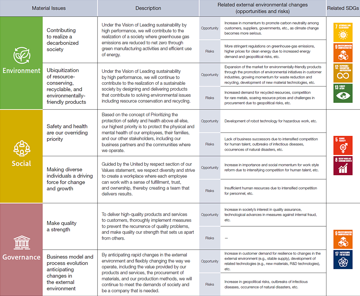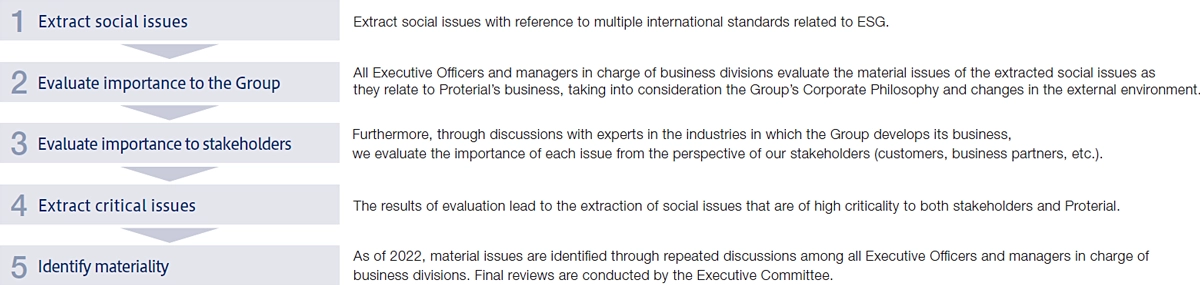 Proterial’s ESG activities in 2022 largely targeted six specific material issues (critical challenges). In identifying these material issues, we began by selecting social issues and then extracting critical challenges based on an evaluation of their importance to the Company and its stakeholders. Building on the aforementioned, material issues were identified through repeated discussions among all Executive Officers and managers in charge of business divisions with final reviews conducted by the Executive Committee.
