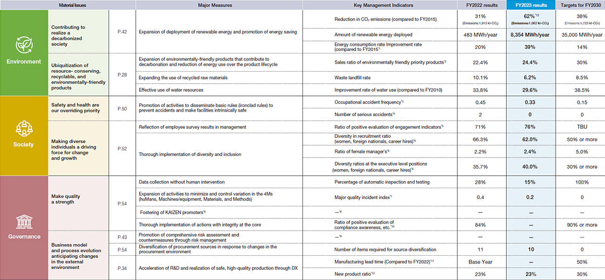 Along with setting major measures to respond to the six material issues identified for the environment, society, and governance, the Group has set indicators to manage the progress of major measures. We are implementing steady measures to achieve the target values of these key management indicators by FY2030.