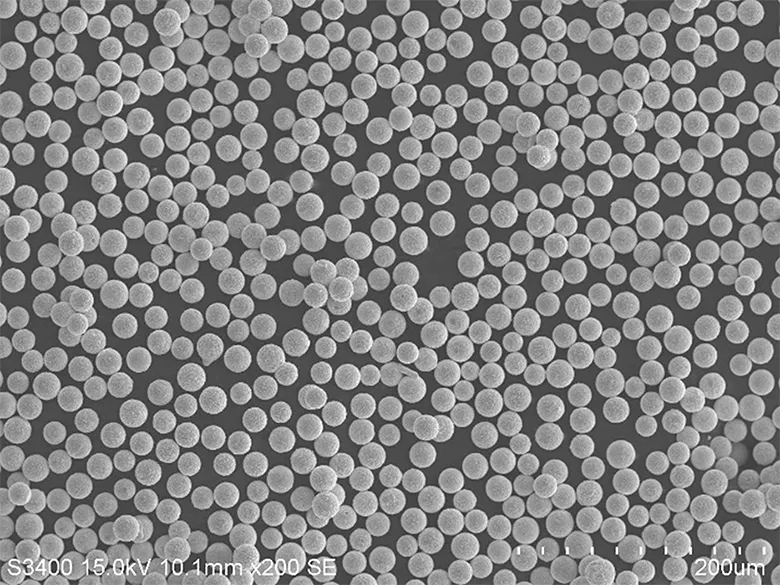 プロテリアル金属は、これまで接合部材として導電性Ni-P微粒子を開発、製造してきました。このNi-P微粒子は、粒径1~30μmのものが製造可能で、耐熱性、均一な粒径(図参照)、高い真球度、高い硬度を特長としています。これまでもめっき品として、高耐食のニーズに応えるため金(Au)めっき品を保有していましたが、低抵抗化には限界がありました。そこで、プロテリアル金属はAu以外の材質をめっきできる新たなめっき技術を開発しました。