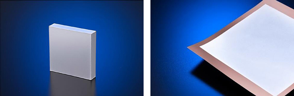 (左: 金属ブロックの全面にALectroを施したサンプル、右: 銅箔にALectroを施したサンプル)