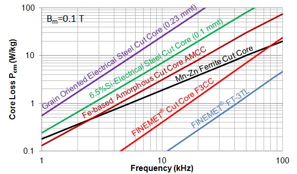 各種コアのコアロスの周波数特性