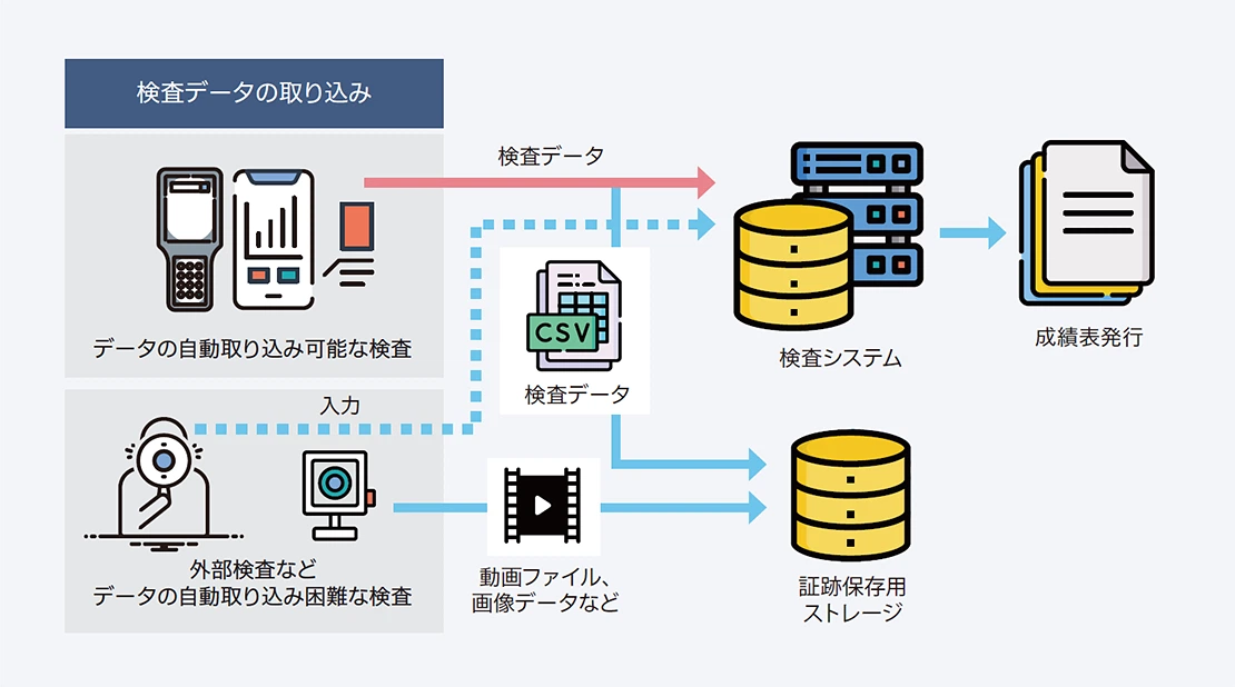 検査システムのセキュア化とは、検査工程で測定した値を記録用紙に手書きしたり、パソコンに入力したりと人が介在するのではなく、計測機器から自動的に測定値をパソコンに取り込み、そのデータを用いて自動的に製品の合否を判定し、お客さまに提出する成績書などを自動的に作成するまでの仕組みを構築することです。これにより、測定値の書き換えを防止するとともに、測定値の書き間違いや打ち間違いなどの作業ミスも防げます。また、測定値を記録紙に記載したり、パソコンに入力したりする必要がなくなるため、検査作業の効率も向上できます。