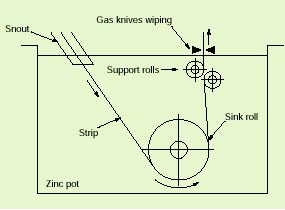 図1に連続溶融亜鉛メッキ浴の概略図を示します。460 ~480℃の溶融亜鉛浴に導かれた鋼板は浴中下部に設けられたシンクロールによって進行方向が変えられ、 同じく浴中に設けられたサポートロールで鋼板の振動抑制や幅方向の反りの矯正をはかりながら垂直方向に引き上げられます。