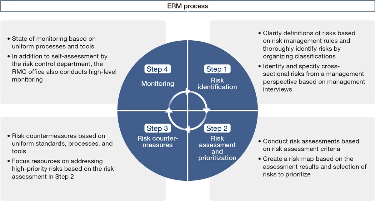 In addition to a bottom-up approach, the Group has established an Enterprise Risk Management (ERM) system in which management (management executives and executive officers) uses a top-down approach to identify and control cross-sectional and medium- to long-term risks from a management perspective. The Risk Management Committee (RMC), chaired by the Chief Risk Control Officer (CRCO), implements ERM processes such as risk identification, assessment, and prioritization, and promotes ERM throughout the Group. Risks are classed and defined as strategic risks, operational risks, and company-wide risks, and the extracted risks are evaluated on a four-level scale based on their impact and likelihood of occurrence. A risk map is created based on the assessment results, and priority risks are selected from the risks positioned in the "high" zone, taking into account their importance and urgency, and are managed by implementing countermeasures and monitoring through RMC. Risks related to climate change identified by the Group Environmental Committee, corporate departments, and business divisions are considered to be risks related to environmental regulations, etc., and are monitored by the RMC as target risks for ERM, along with other risks. The RMC shares the status of risk responses and related monitoring results, and reports to management.