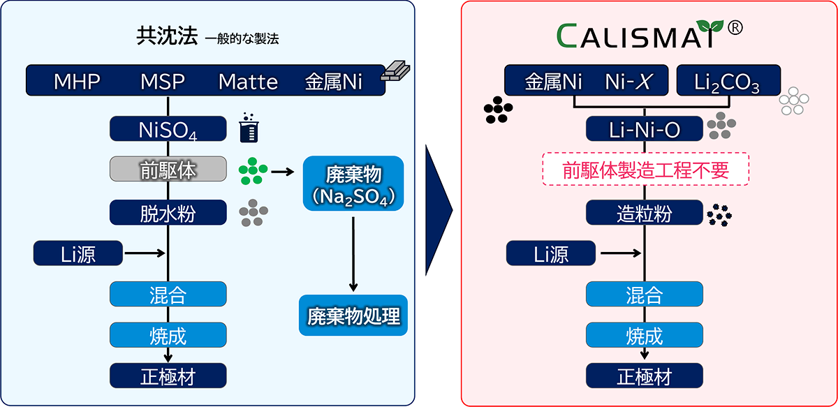 プロテリアルは、粉末冶金技術による固相反応法※3を用いることで、前駆体を製造しないLIB用正極材製造技術CALISMAT®を開発しました(図3)。CALISMAT®適用により金属ニッケル(Ni)や酸化ニッケル(NiO)など、硫酸ニッケル(NiSO4)以外の出発原料を選択できること、硫酸ナトリウム(Na2SO4)などの廃棄物処理が不要となるなどのメリットがあります。