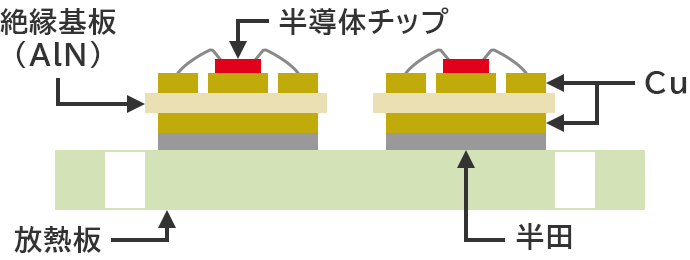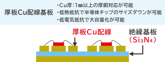- 2当社は、新規に開発した高強度・高熱伝導Si3N4を絶縁基板として用いることにより、図2に示すようにモジュール構造を簡略化できました。厚板Cuを接合可能により、熱抵抗を下げることができ、さらに放熱板を省略することにより構造簡略化ならびに低コスト化が達成できます。